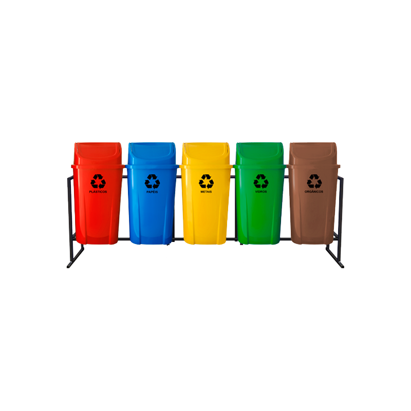 PODEM SER ENCAIXADAS UMAS ÀS OUTRAS E POSSUEM UM SISTEMA QUE PERMITE QUE O SACO DE LIXO FIQUE PRESO ADEQUADAMENTE. VENDIDAS EM DIVERSAS CORES, SÃO MUITO UTILIZADAS PARA COLETA SELETIVA.